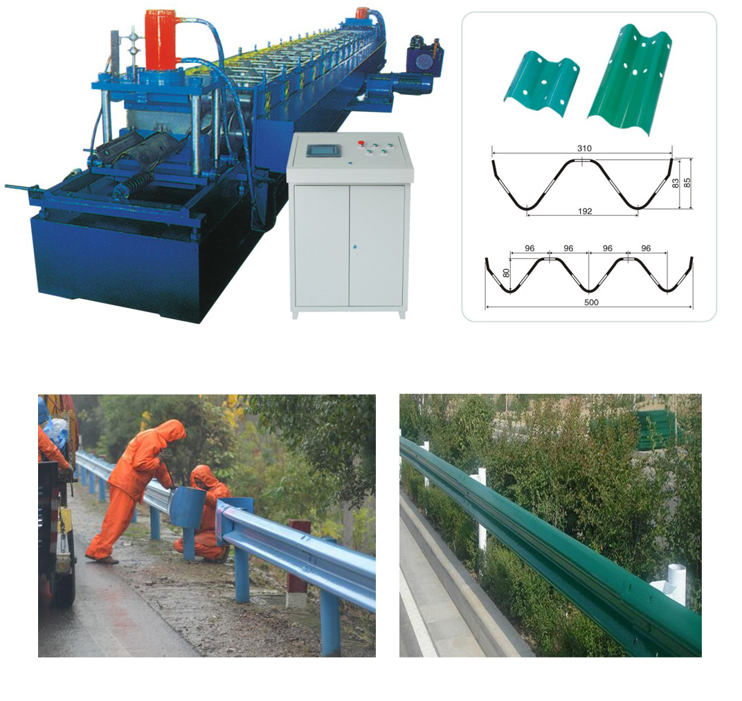 350型高速護(hù)欄板成型壓瓦機(jī)主要由開卷機(jī)、校平機(jī)、沖孔機(jī)、沖中孔機(jī)、成型主機(jī)、成型剪切裝置、液壓站、電腦控制系統(tǒng)、成品托架等幾部分組成。