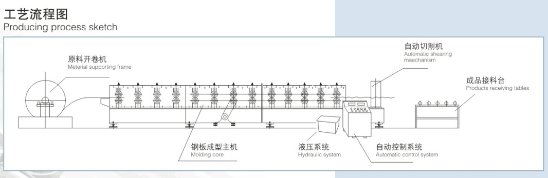 開卷機(jī) 成型主機(jī) 液壓切刀 電控系統(tǒng) 液壓系統(tǒng) 出料架