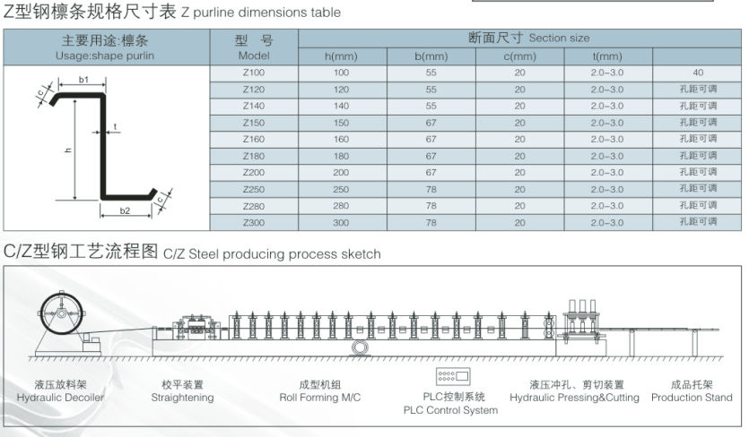 經(jīng)該機輥軋的c型檁條成品具有良好的抗彎抗壓性能,平直度好、全自動定長切割、自動沖孔、自動化程度高,安裝快捷方便。 產(chǎn)品可作為大中型工業(yè)民用建筑的主體受力結(jié)構(gòu),如廠房、 倉庫、機車庫、飛機庫、展覽館、影劇院、體育場館、集市花棚的屋面承重荷載和墻面支撐。